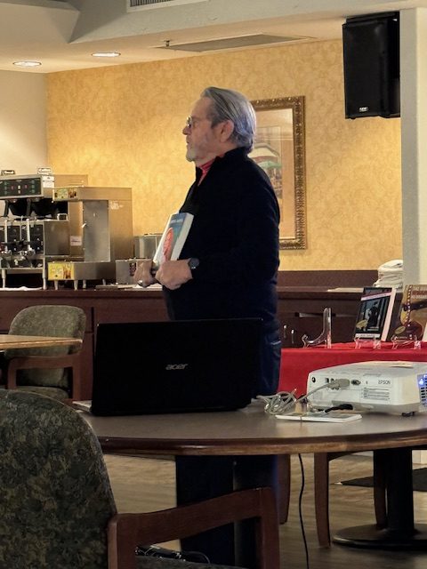 Using PowerPoint, he gave a ‘National Geographic tour’ with photos of his international work, explaining how his travels and work provided much material for his writing. He then discussed his memoir which he is re-writing and expanding (Feb 2024) and his novels. A long Q & A session regarding how, what, and where he writes was followed with a book signing session.